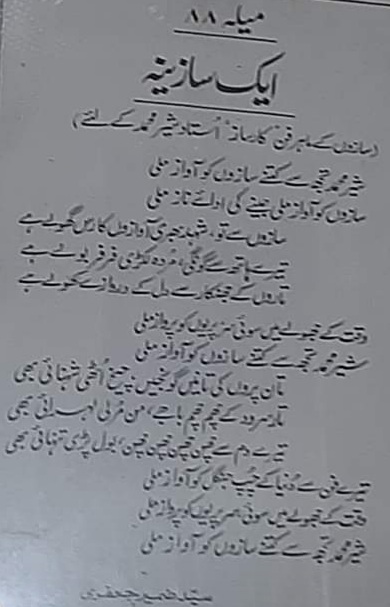 An Orchestra (Translated by Mubeen Irfan Chaudhary) Sher Muhammad, into how many instruments have you instilled the miracle of life? The instruments came to life, and they learnt their art. From your instruments you coax honey-filled voices, From your hands, dead and dumb wood begins to sing. From the sparkling of the stars the doors of the heart have opened And the fairies that slept for eons, woke up and flew high. Sher Muhammad, into how many instruments have you instilled the miracle of life? The voices of the tanpuras boomed, the shehnai’s shrieks pierced the air, The sarod’s strings went “chum chum”, my flute shrilled too. From your breath even loneliness spoke, From your art the quiet jungle of this world got a voice And the fairies that slept for eons, woke up and flew high. Sher Muhammad, into how many instruments have you instilled the miracle of life?